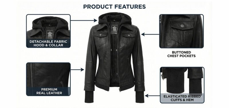 We created the Womens Bomber Leather Removable Hooded Jacket for flexibility, movement, and modern confidence with classic craftsmanship. Moreover, made of real leather with a smooth finish that feels strong and eye-catching. This jacket is lightweight and breathable, so you can experience its luxuriousness in any season. The front zipper closure makes it smooth to glide on and functional. In addition, the traditional turn-down collar maintains its bomber appeal while adopting casual aesthetics. The viscose lining is comfortable and can be worn throughout the day as well as at night. Aaddition, its sleek lines add to its luxurious style. The long sleeves have a balanced, sophisticated shape that is not too tight. Buy Womens Bomber Leather Removable Hooded Jacket For Sale from our Women’s jacket collection to look stylish yet empowered.